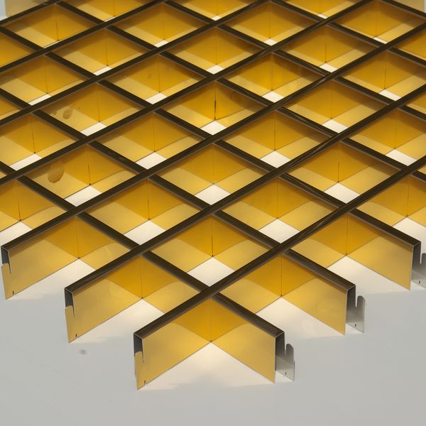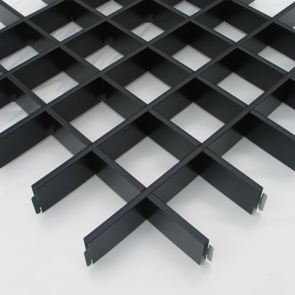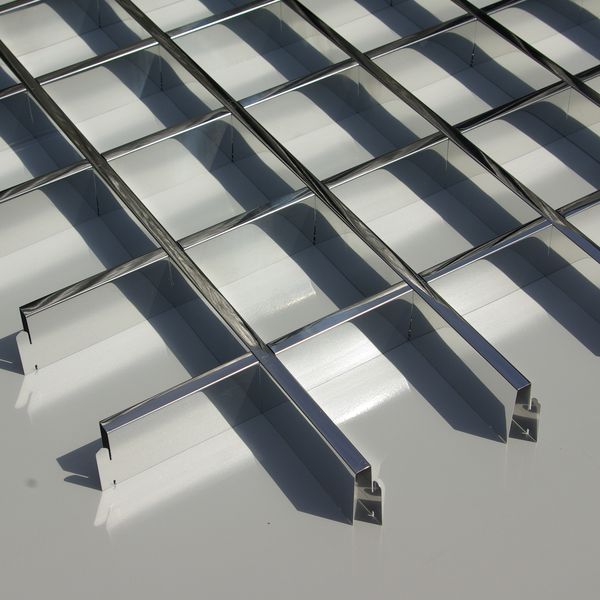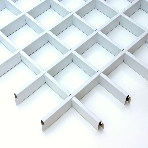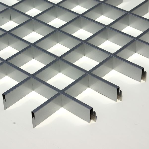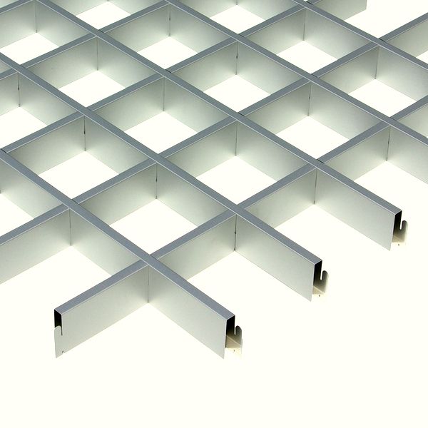 Потолок Грильято (его еще называют решетчатый или ячеистый потолок) представляет собой подвесной потолок, состоящий из решеток. Эти решетки в свою очередь собираются из U-образных профилей, которые называются «папа» и «мама». Решетки устанавливаются на несущие направляющие длиной 600 мм, 1200мм и 1800мм (несущие С60, С 120 и С180 соответственно). Для монтажа несущих С180 требуется соединительный элемент. Потолок Грильято бывает белого цвета, также можно встретить цвет суперхром, алюминий матовый или алюминий серебристый. Вес потолка Грильято зависит размера ячейки ( 2-6 кг/кв.м). Ячейки бывают следующих размеров: 40х40 мм, 50х50 мм, 60х60 мм, 75х75 мм, 86х86 мм, 100х100 мм, 120х120 мм, 150х150 мм, 200х200 мм. U-образный профиль бывает двух вариантов, отличающихся по высоте: 40 или 50мм.